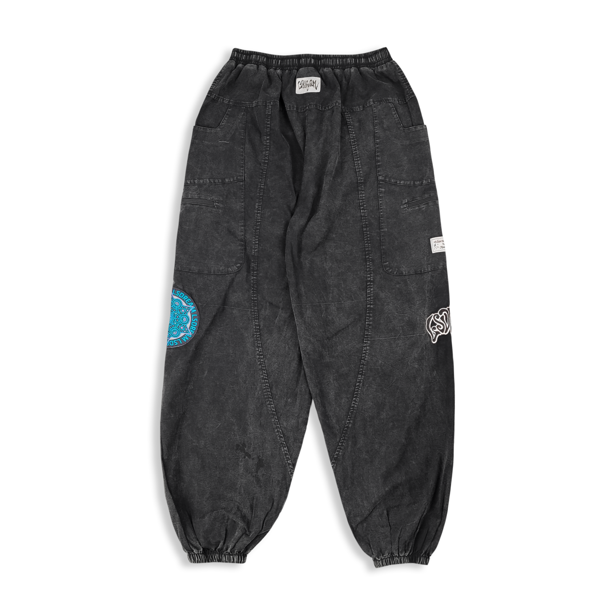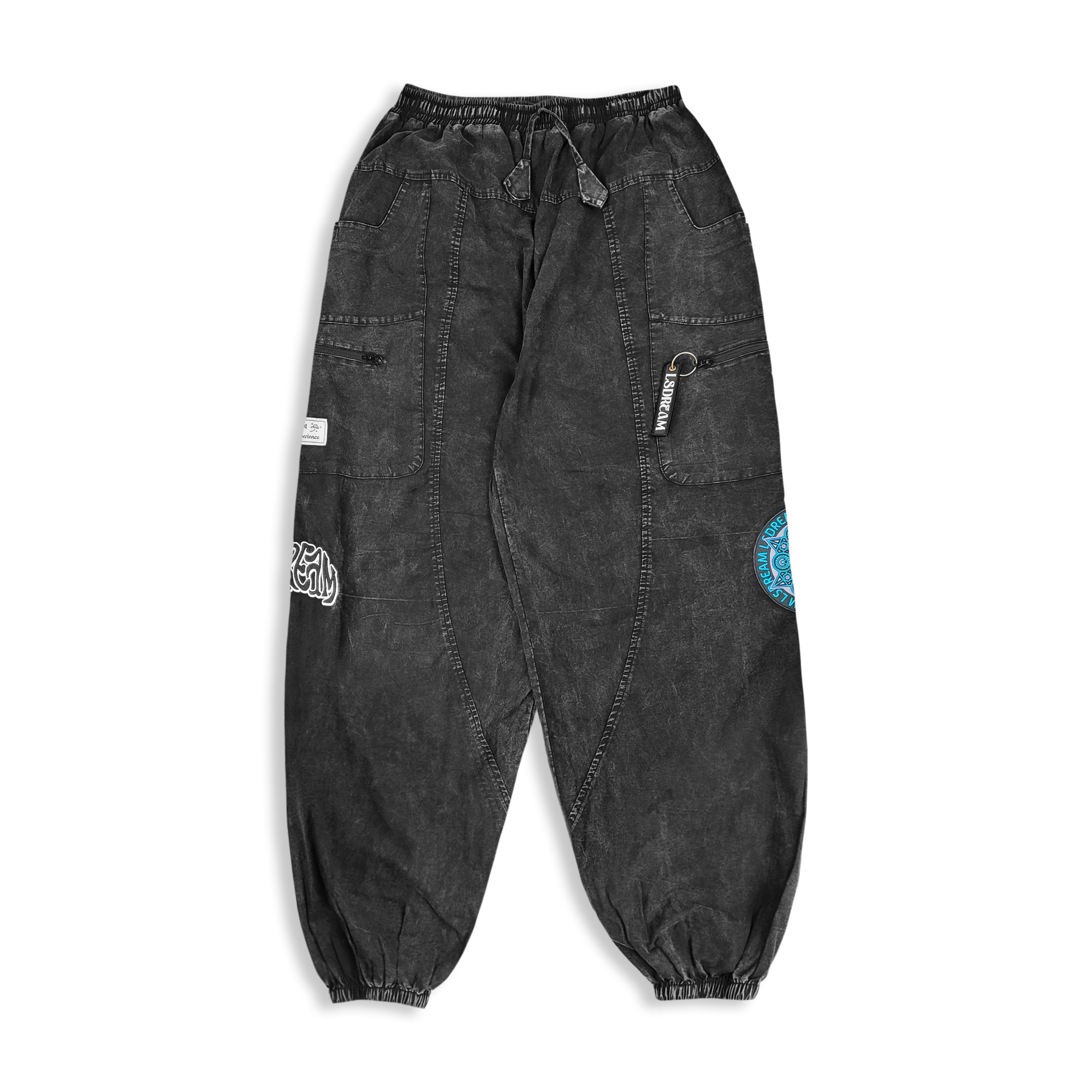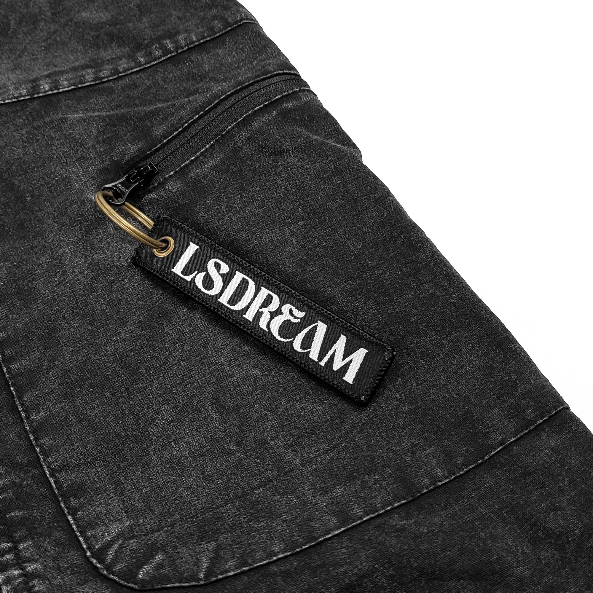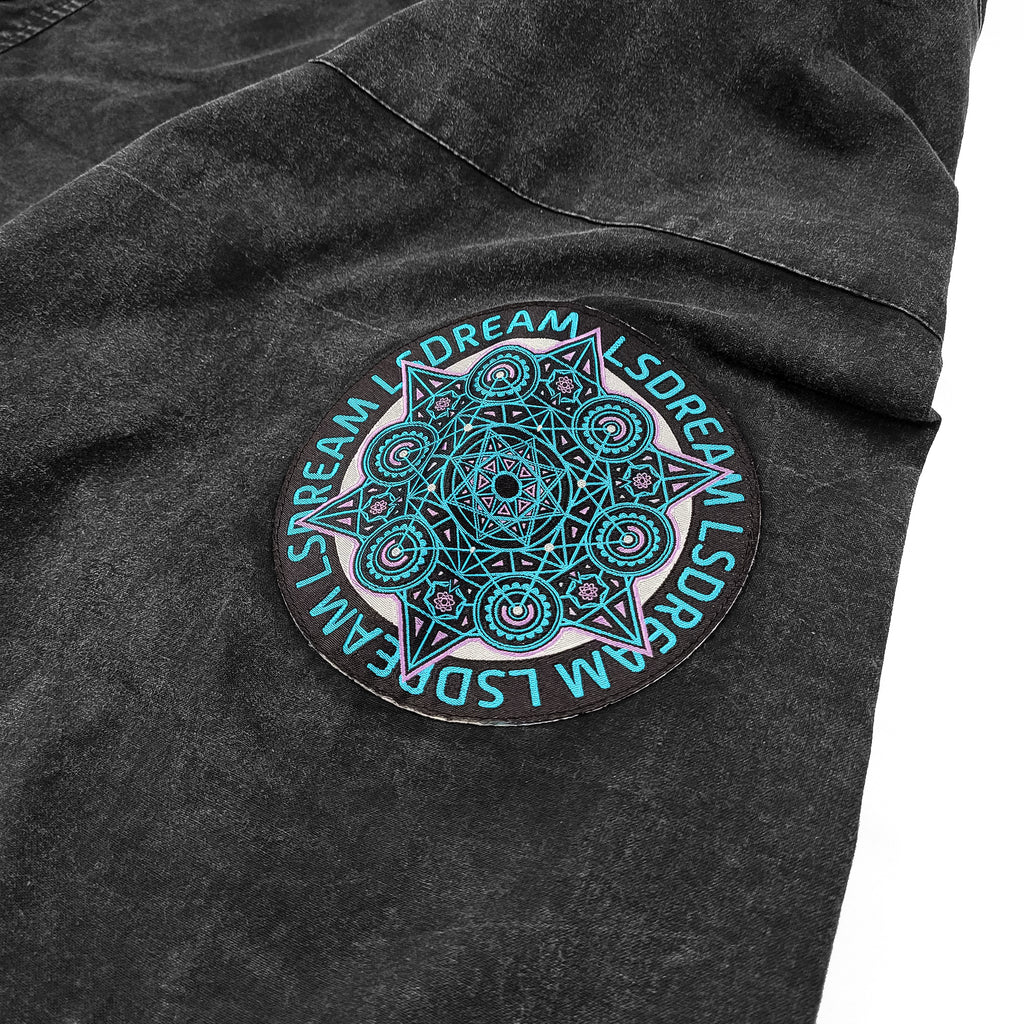 - Embroidered patch w/ brass ring attached to zipper on left leg pocket
