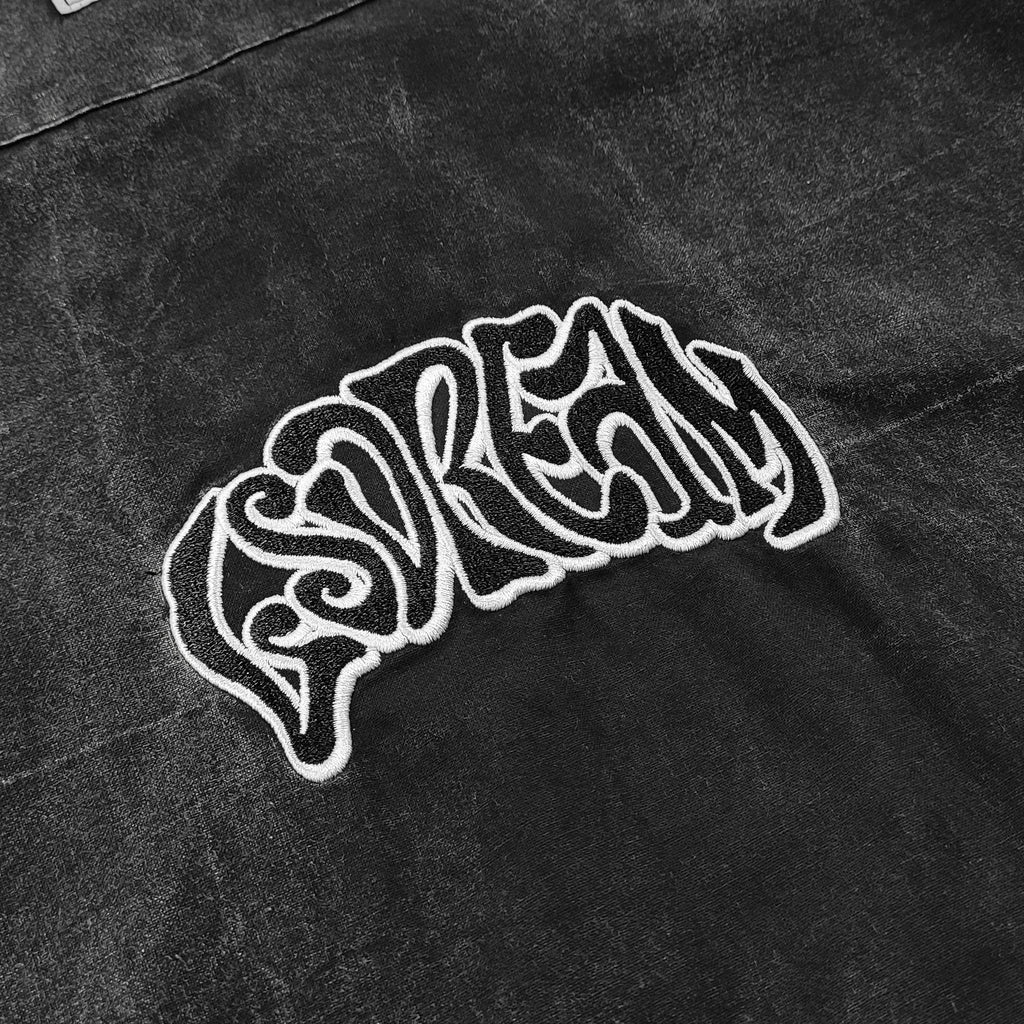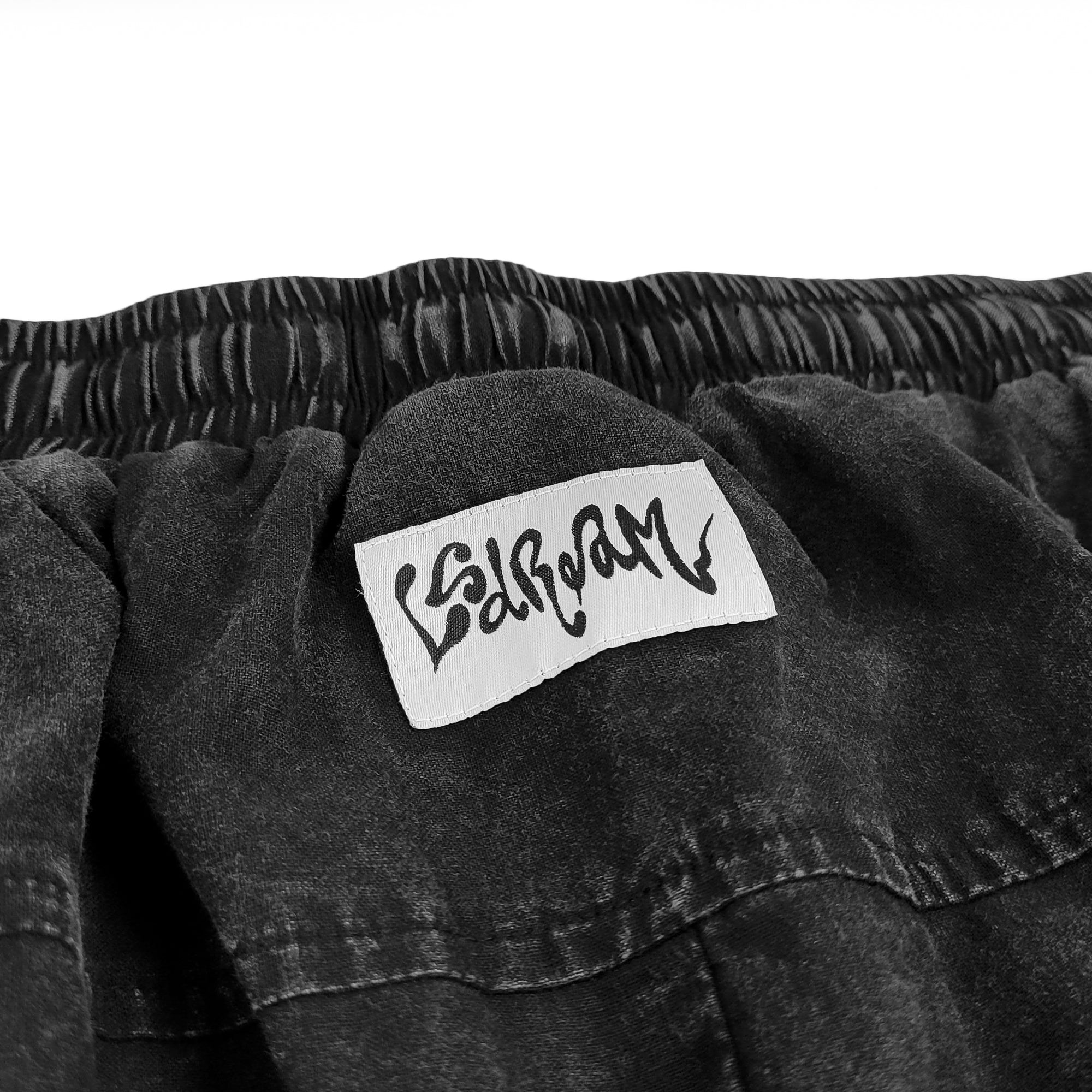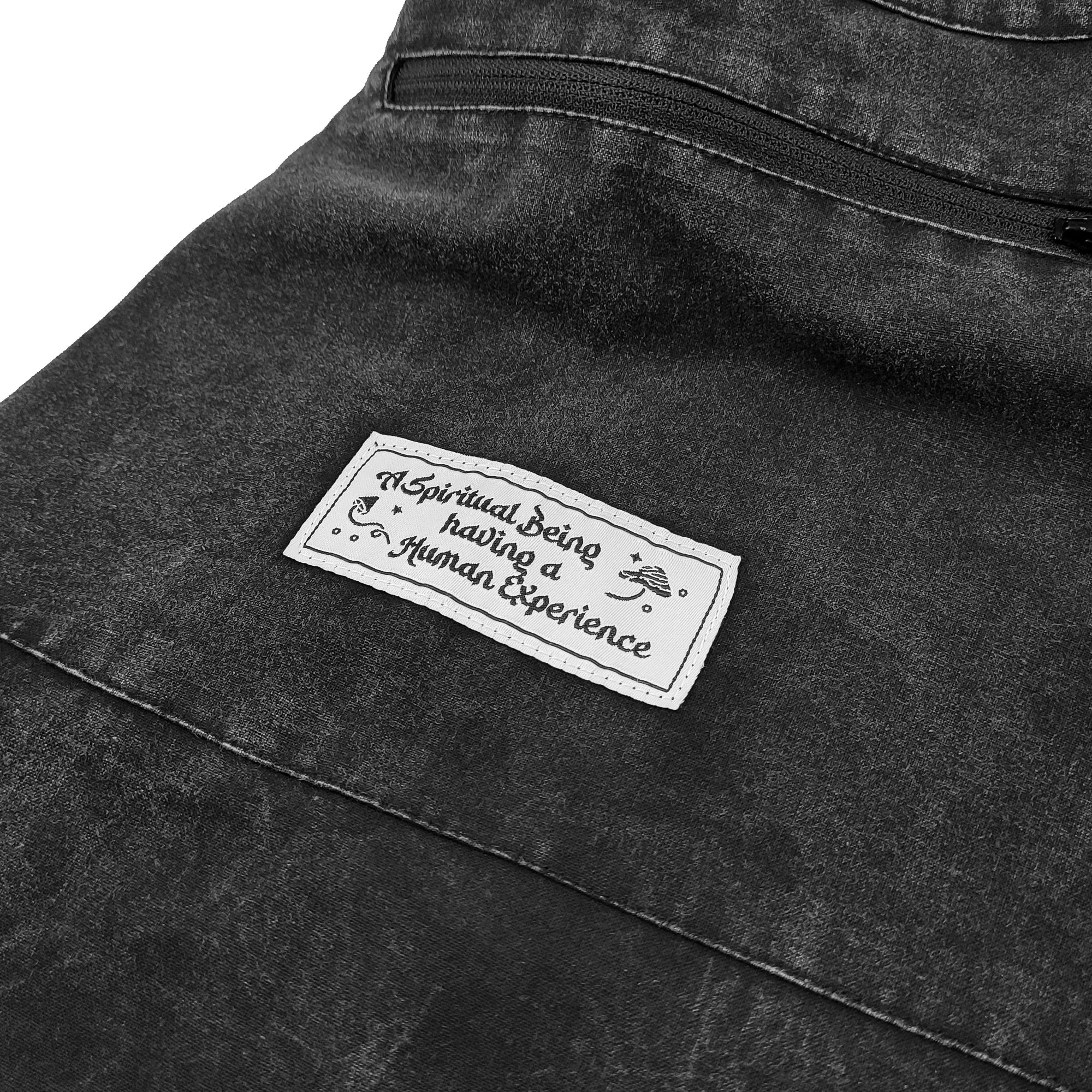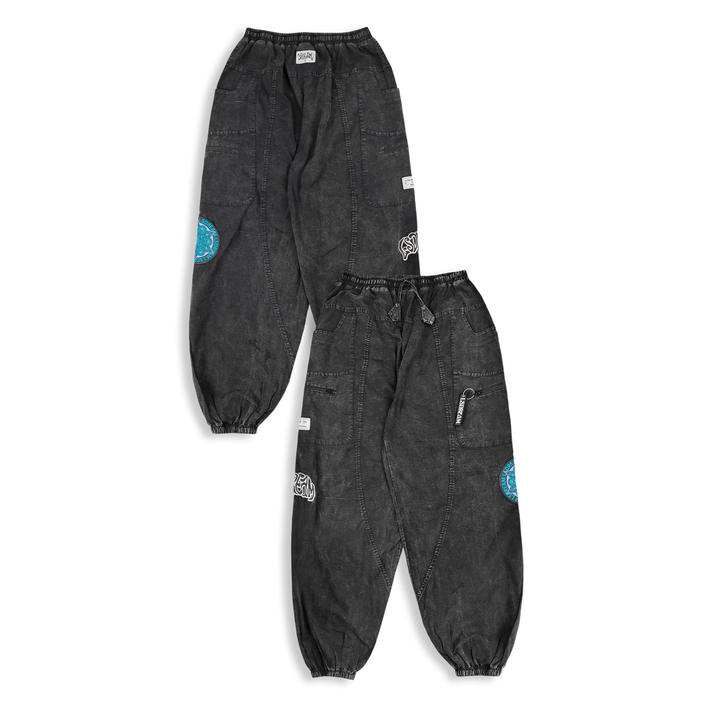 - Embroidered patch w/ brass ring attached to zipper on left leg pocket